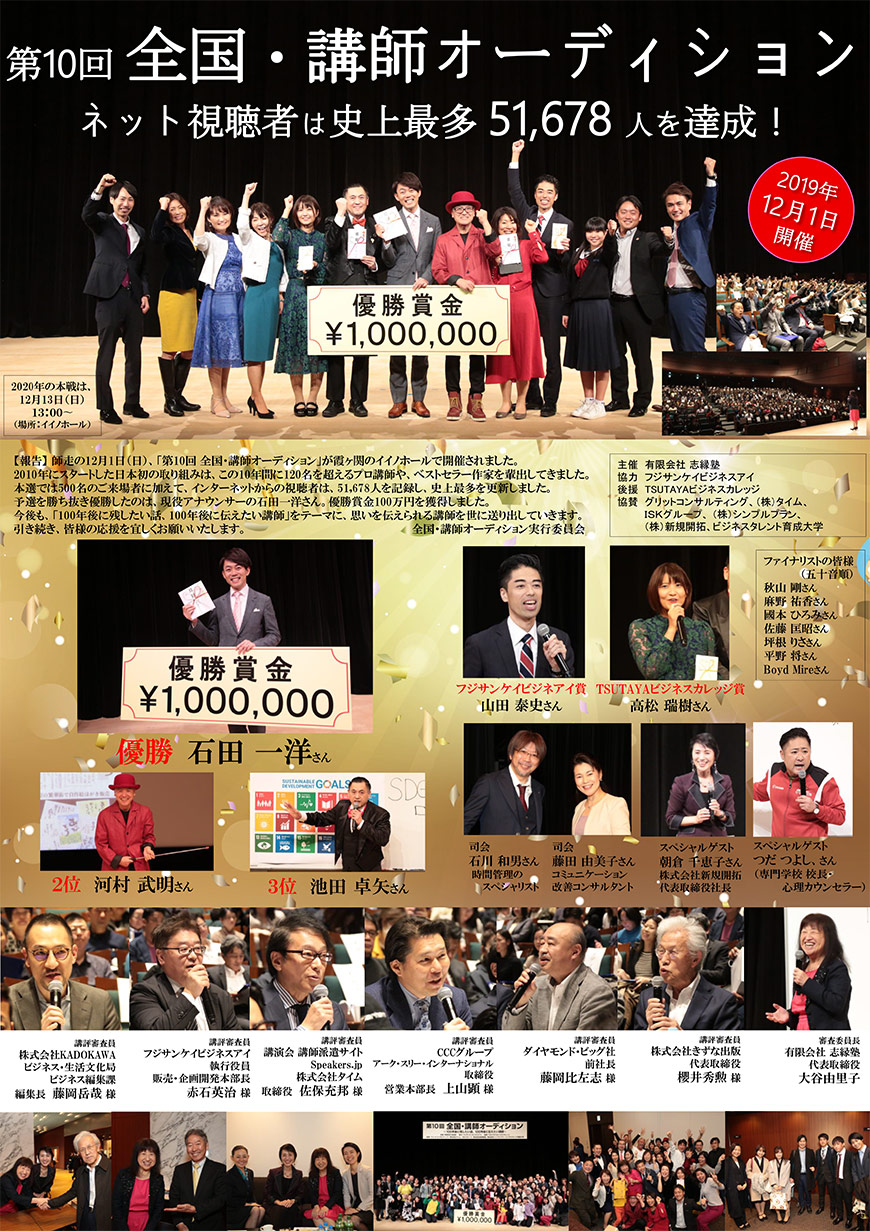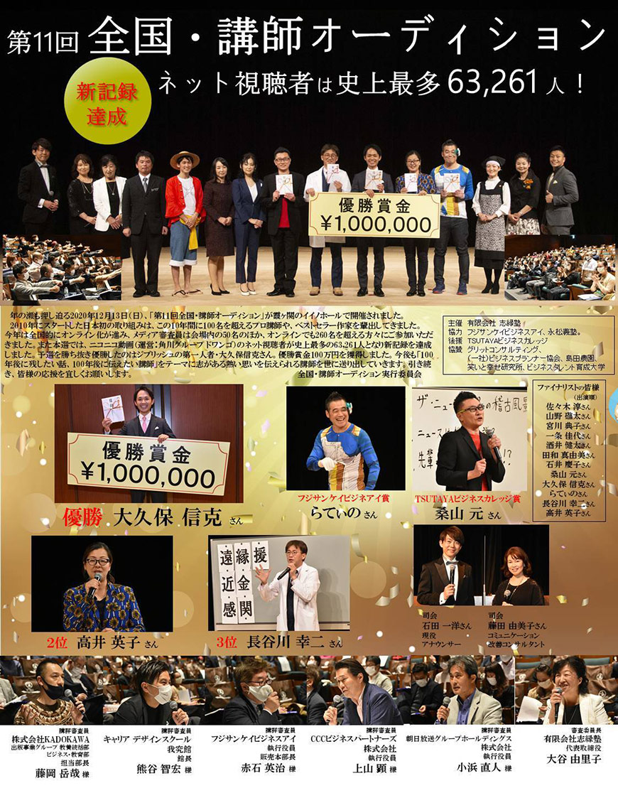 本選の写真2020年の記録 1.リハーサル 2.エントランス 3.楽屋 4.ファイナリスト 5.授賞式 本選の写真2019年の記録 1.リハーサル 2.エントランス 3.楽屋 4.会場内 5.ファイナリスト 6.大谷由里子のトークライブ 7.授賞式 8.懇親会 本選の写真2018年の記録 1.リハーサル 2.エントランス 3.楽屋 4.会場内 5.ファイナリスト 6.講評の様子 7.大谷由里子のトークライブ 8.授賞式 9.懇親会 Tweet